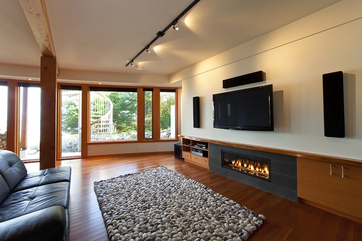 This distinctive, three-storey home is built on the Denman Island’s waterfront. A two-storey concrete wall cuts into the sloping bank forming the back wall of the first and second floors. The top floor, with the main living area and entry, is at road level.